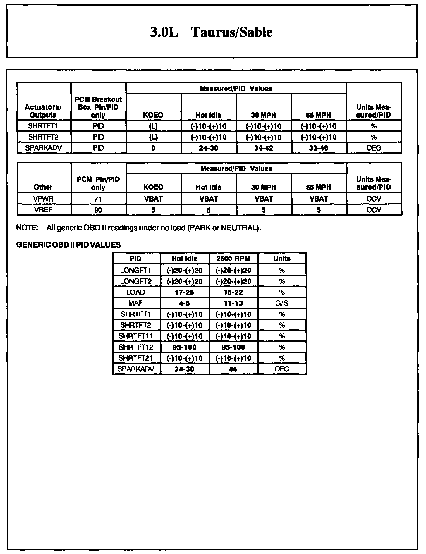 Normal Scan Data Values - Includes PIDs