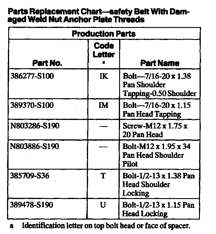 Parts Replacement Chart - Safety Belt With Damaged Weld Nut Anchor Plate Threads: