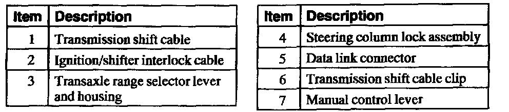 ^ an ignition/shifter interlock cable on floor-shift vehicles which connects the transaxle range selector lever to the steering column lock assembly.