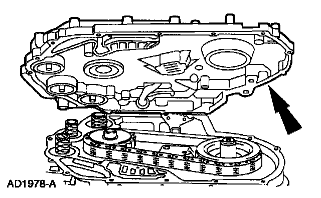 9. CAUTION: The overdrive band servo spring cover is under spring tension. Care must be taken during removal as components may be ejected from the case.