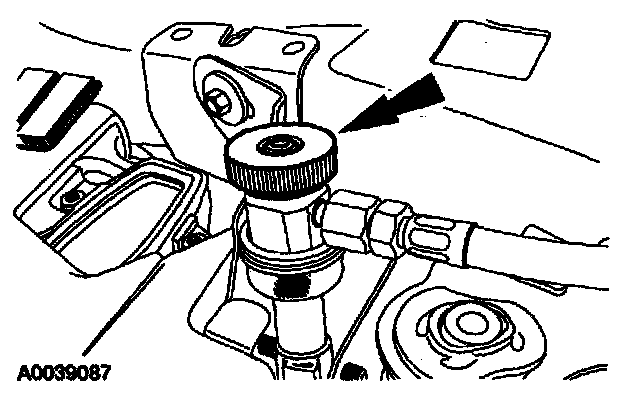 8. Remove the fluorescent dye injector from the low-pressure service gauge port valve and the R-134a A/C refrigerant service center or manifold gauge set.