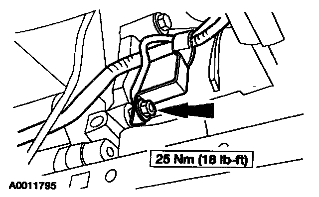 5. Remove the battery cable harness retaining bracket nut. Remove the bracket and the engine ground cable from the stud.