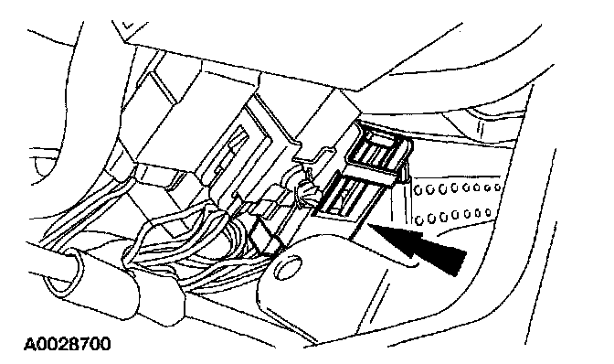 7. From under the driver seat, remove the restraint system diagnostic tool from the driver seat side air bag floor electrical connector.