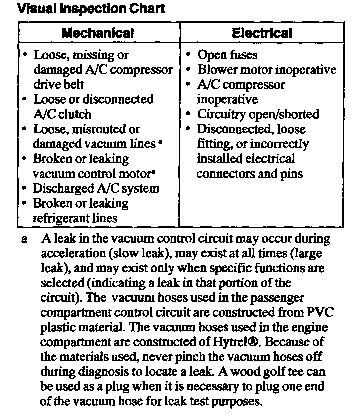 1. Verify the customer's concern by operating the climate control system to duplicate the condition.Visual Inspection Chart: