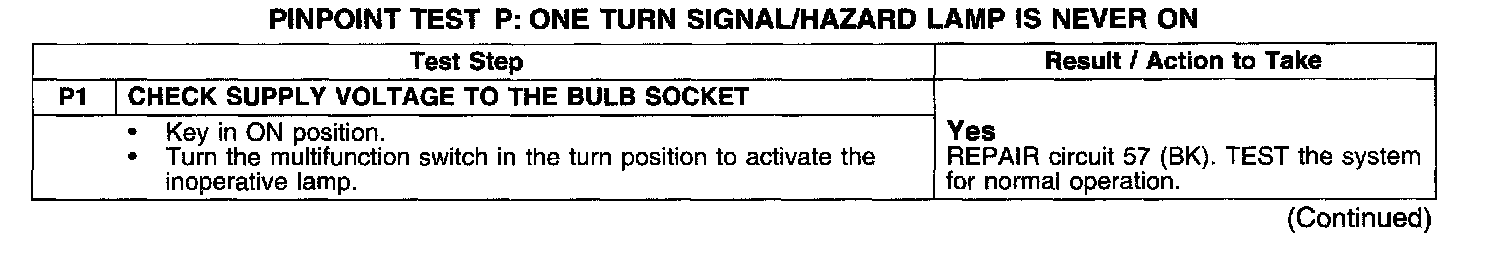 PINPOINT TEST P: ONE TURN SIGNAL/HAZARD LAMP IS NEVER ON