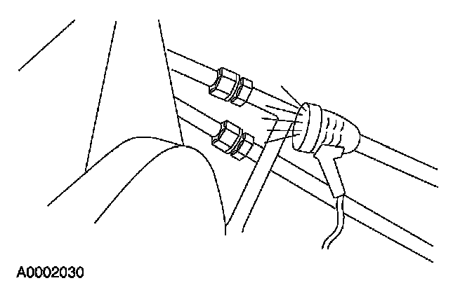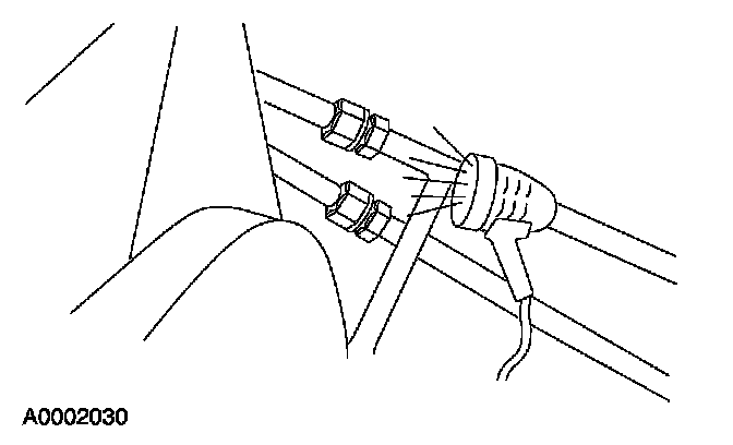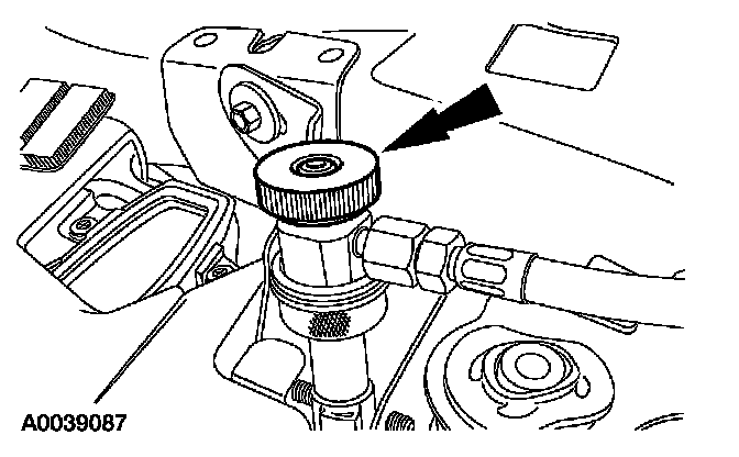 8. Remove the fluorescent dye injector from the low-pressure service gauge port valve and the R-134a A/C refrigerant service center or manifold gauge set.