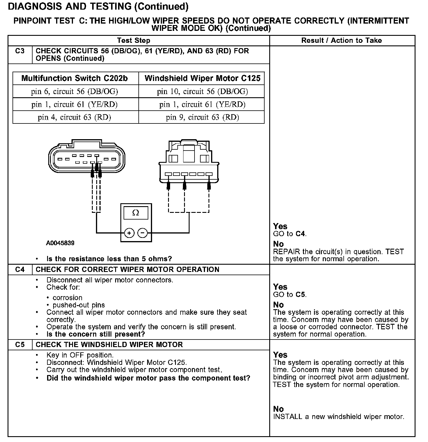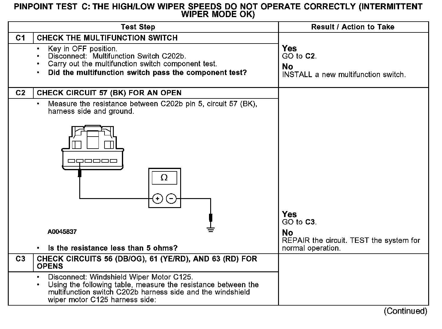 PINPOINT TEST C: THE HIGH/LOW WIPER SPEEDS DO NOT OPERATE CORRECTLY (INTERMITTENT WIPER MODE OK)