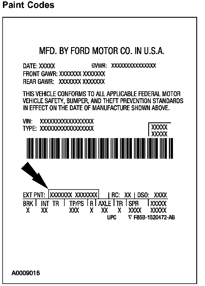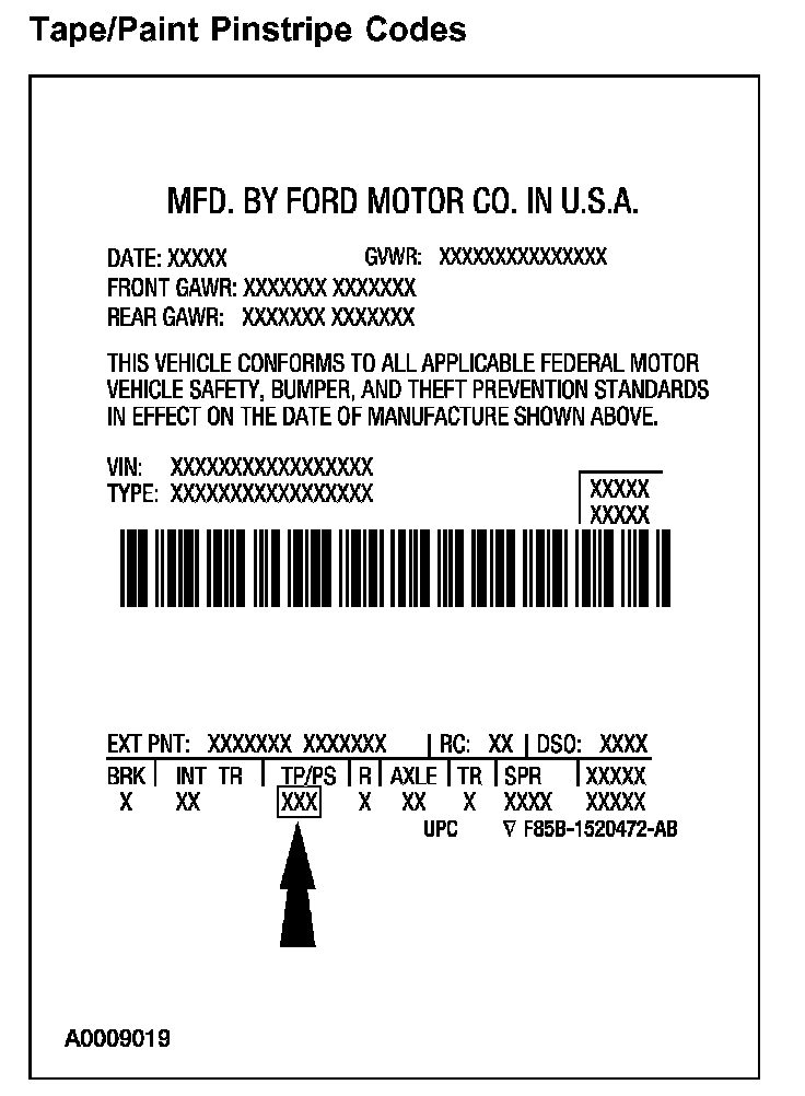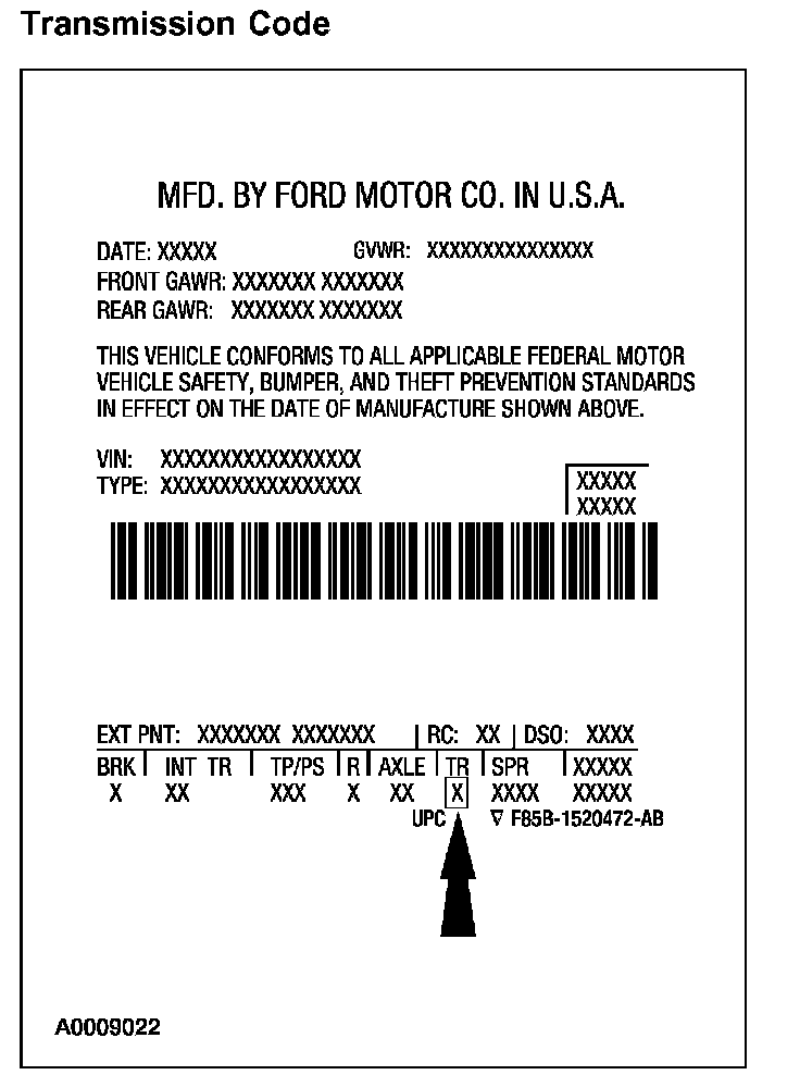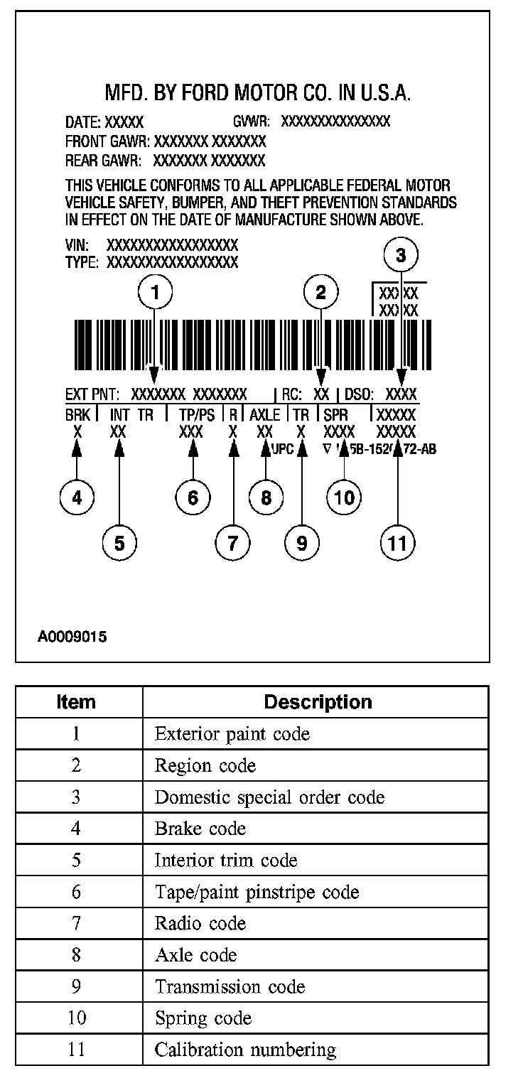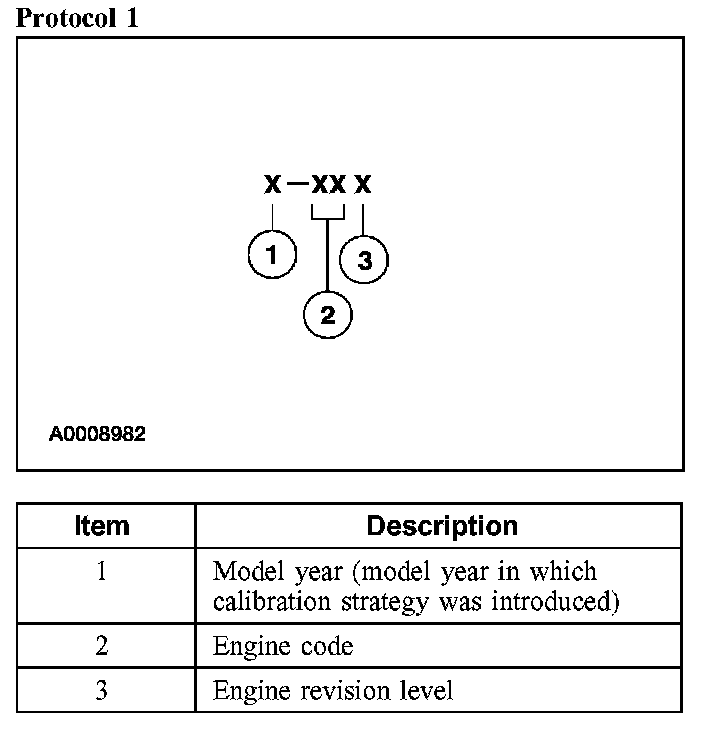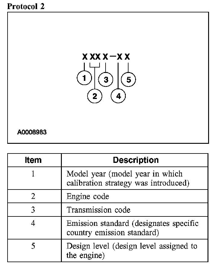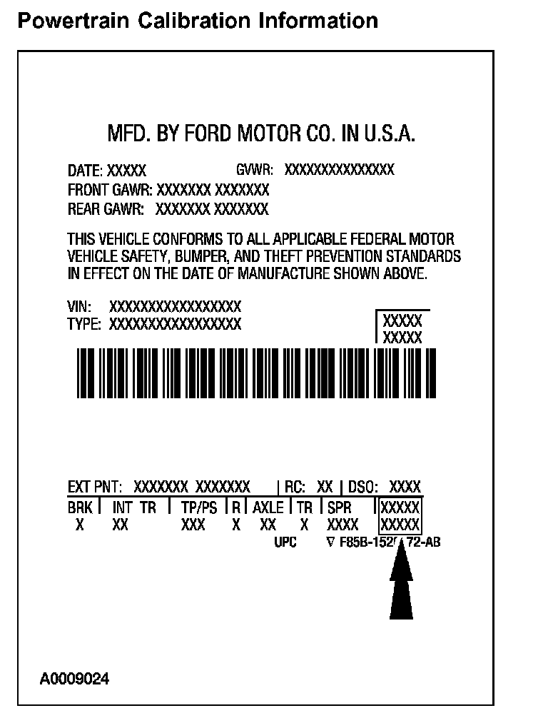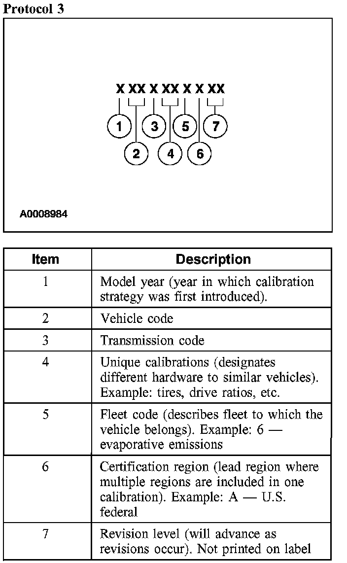 Powertrain calibration information is printed in the lower right corner of the Vehicle Certification Label. Only the base calibration information is printed. Revision levels will not appear, however, they can be found in On Line Automotive Service Information System (OASIS). For the current model year, Ford Motor Company is using three different protocols which describe powertrain base calibration. These protocols are designed to provide worldwide standardization for vehicle calibration. If the electronic calibration strategy has been used since 1998 and carried into the current model year, Protocol 1 will be used. Refer to Protocol 1. If the electronic calibration strategy has been used since 1999 and is carried into the current model year, Protocol 2 will be used. Refer to Protocol 2. For electronic calibration strategies introduced in 2000 or later model years, Protocol 3 will be used. Refer to Protocol 3.