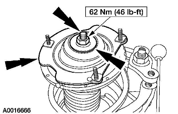 While holding the strut rod, remove and discard the nut. Remove the cupped washer and the upper mount and seat-bearing assembly.