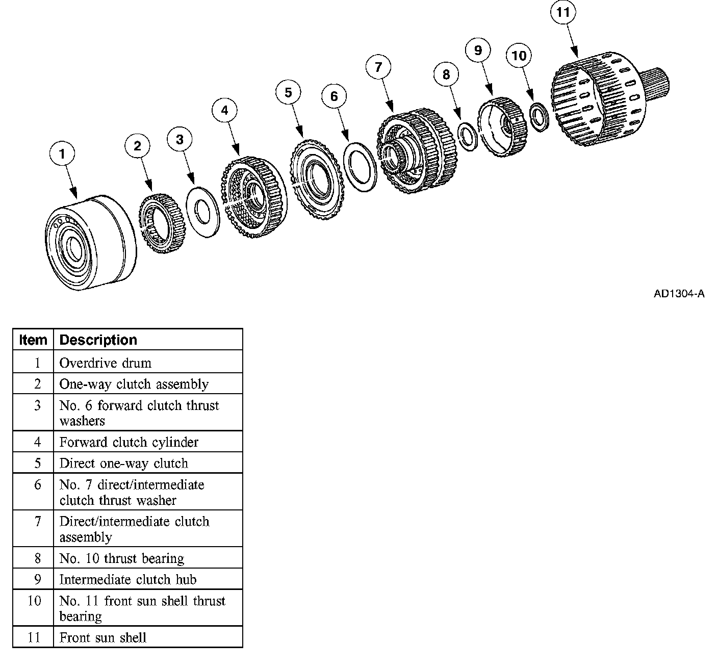 7. Install the rear clutch hub and the No. 10 thrust bearing.