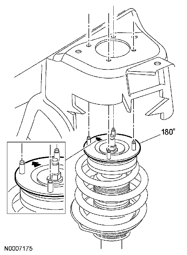 3. CAUTION: Do not rotate the strut mount to any other position than 180° from its original position; the arrow (located on top of the strut mount) must either point to the 3 o'clock or the 9 o'clock position.
