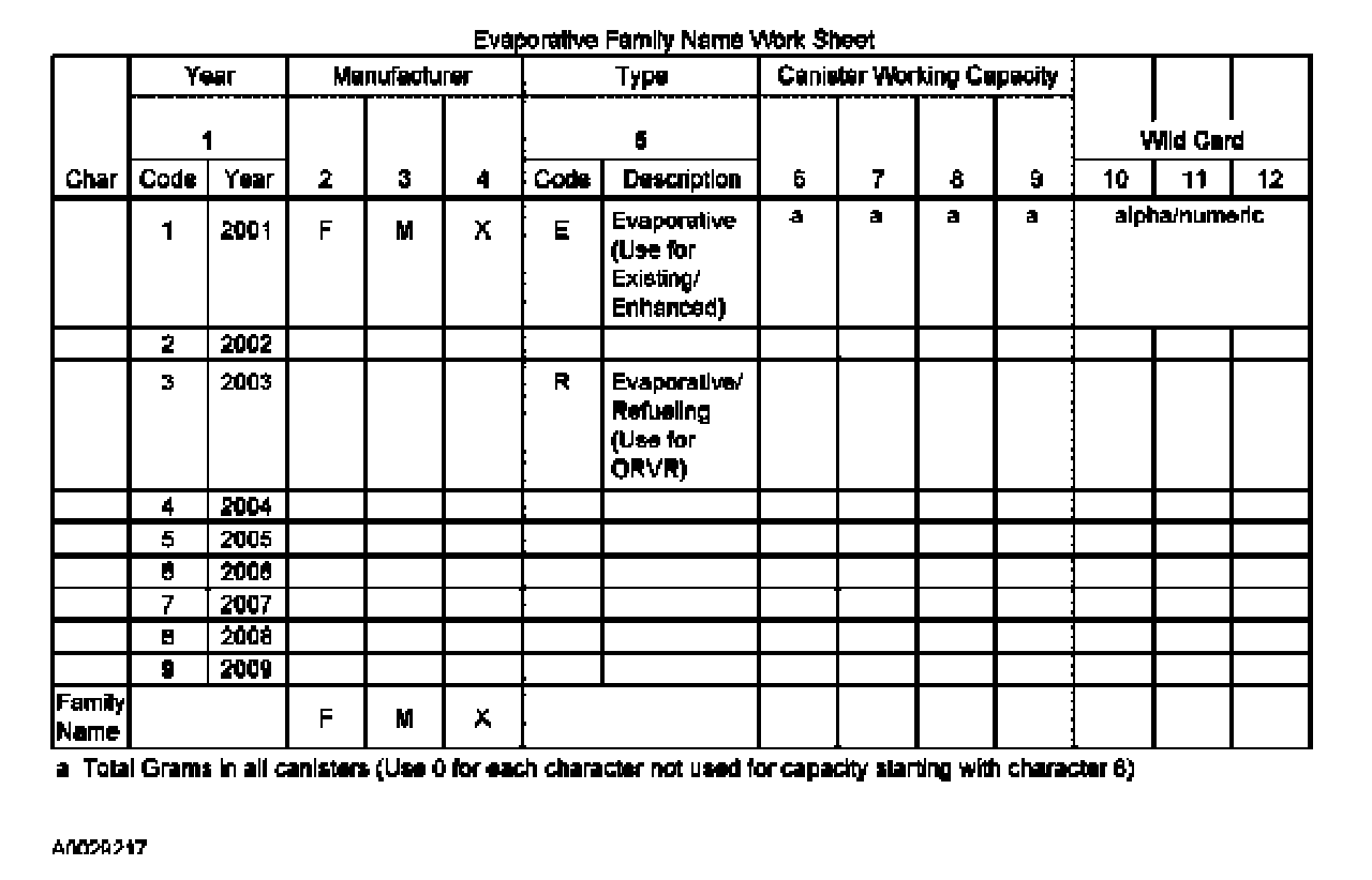 Both the engine family group and the evaporative family name are listed in the box on the emission decal as indicated in the area marked as engine evaporative family information. The first line contains engine size and the 12-character engine family group. The second line contains the 12-character evaporative family name information. Both the engine family group and the evaporative family name are specific to the vehicle. Please refer to the Engine Family Group and the Evaporative Family Name work sheet for decoding information.