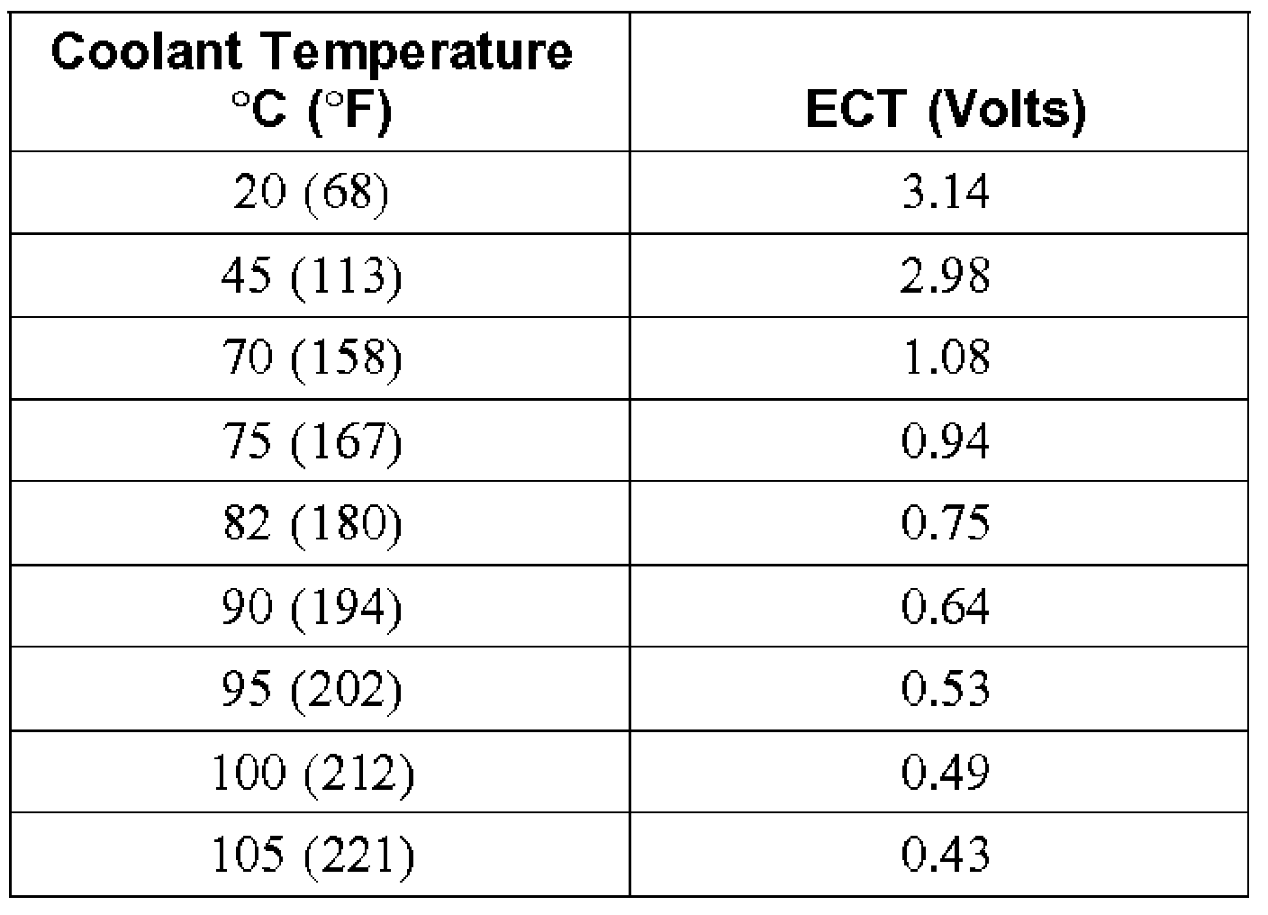 4. Start the engine and allow the engine to idle throughout this test. Allow the engine to run for two minutes, then record the ECT voltage. Record the ECT voltage every 60 seconds. When the ECT voltage trend changes direction or only changes slightly (0.03 volt or less) from the previous reading, record this as the thermostat opening voltage. Use the voltage and corresponding coolant temperature chart listed below.