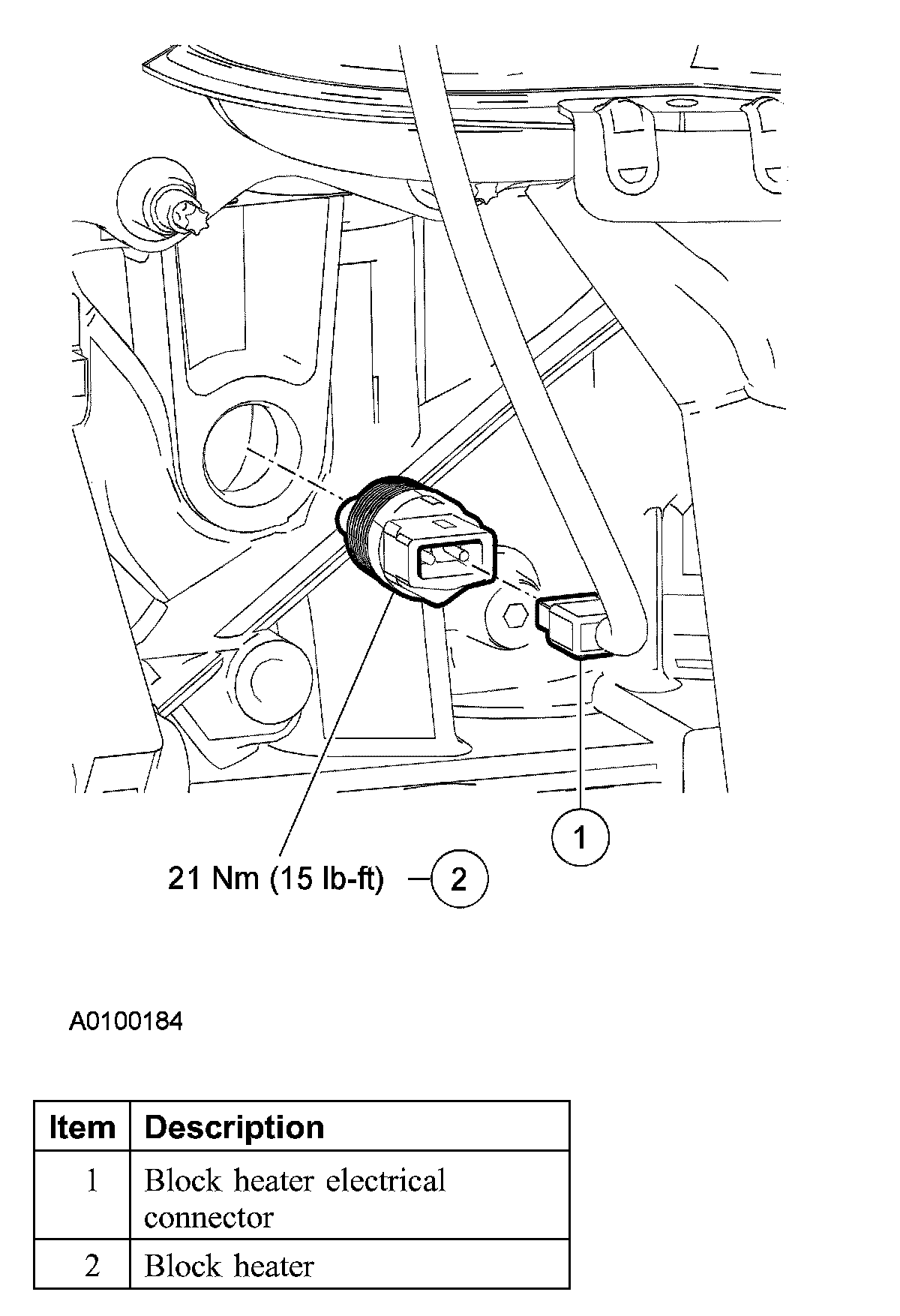Disconnect the block heater electrical connector and position aside.