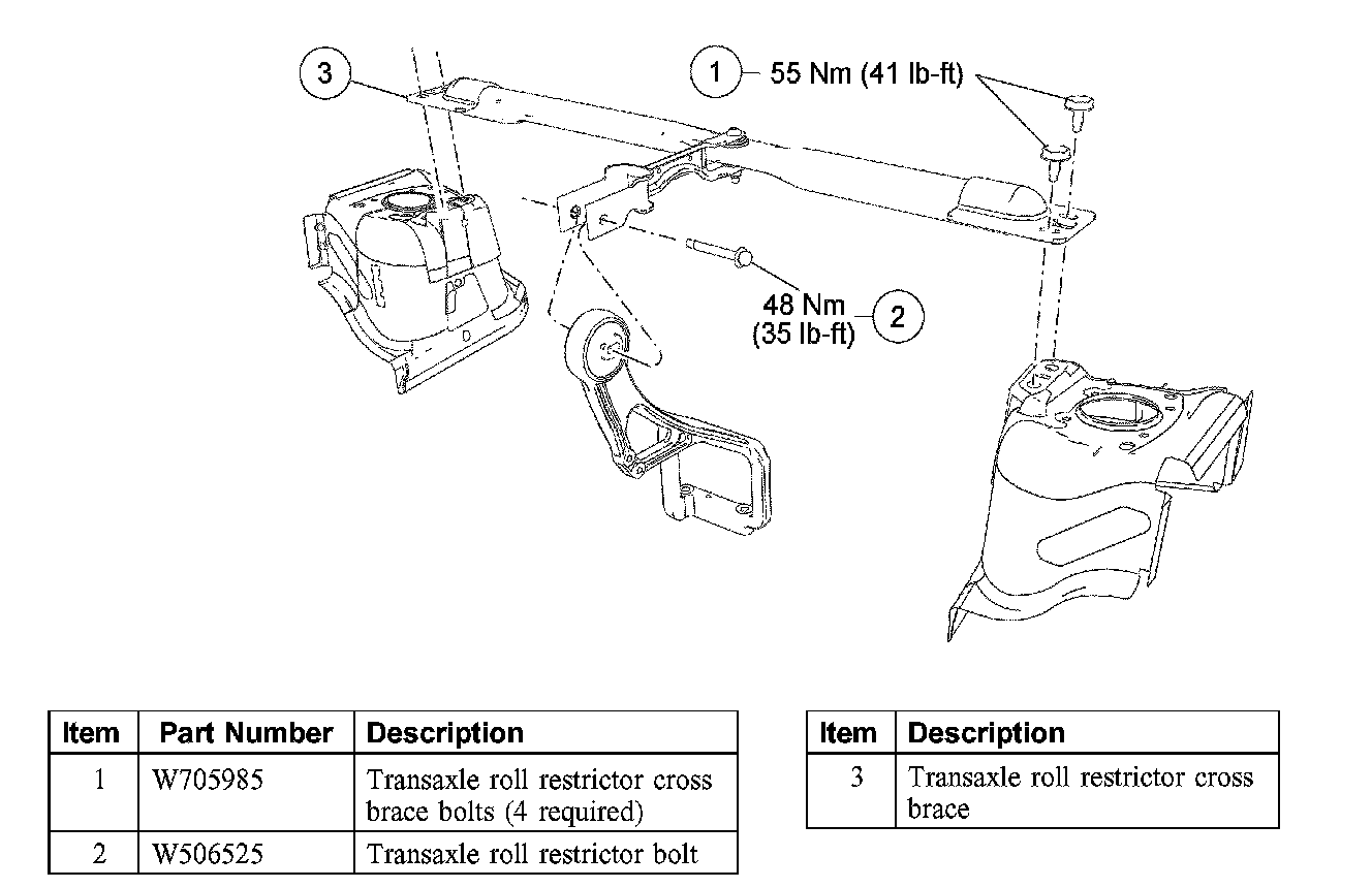 13. Install a new transaxle roll restrictor cross brace-to-roll restrictor bolt.