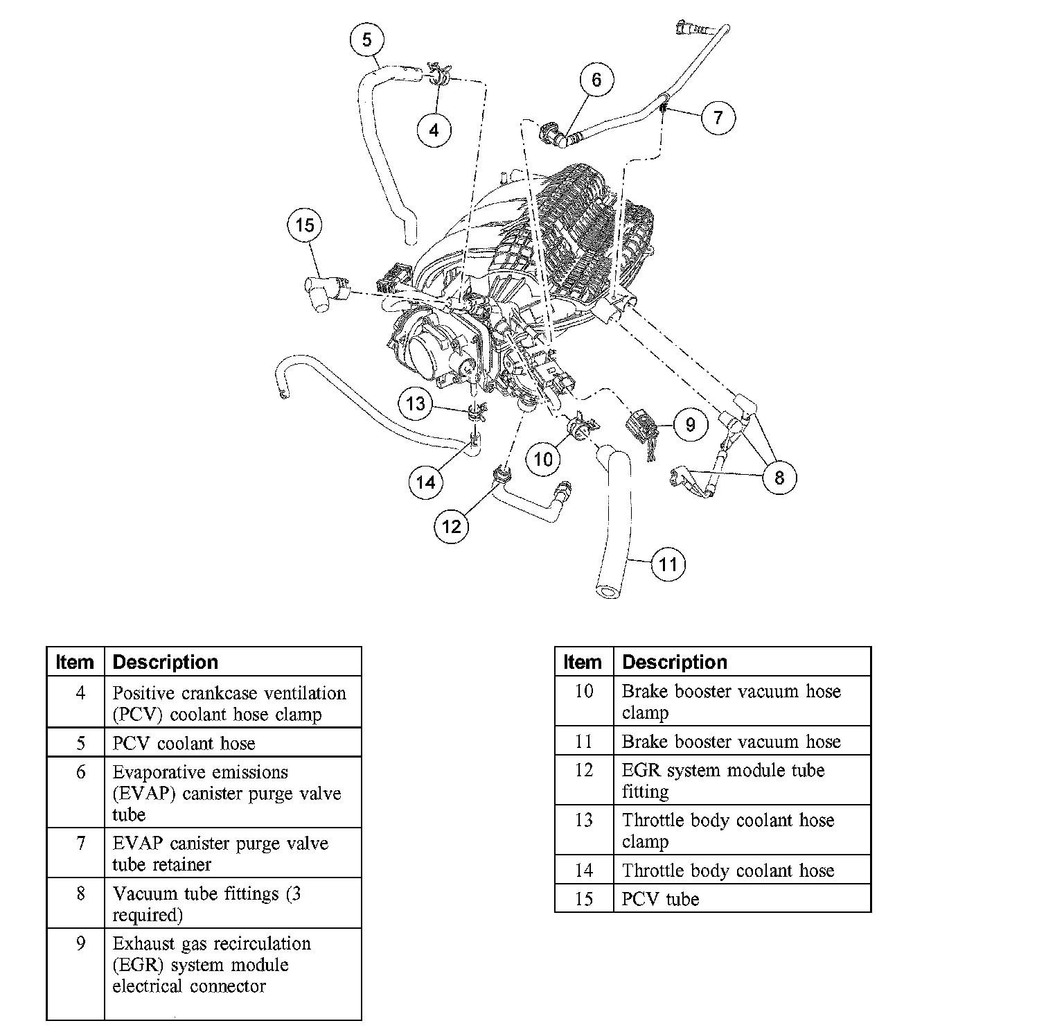 6. Disconnect the positive crankcase ventilation (PCV), brake booster and vacuum harness tubes from the upper intake manifold.