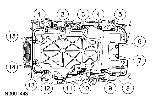52. Tighten the 15 oil pan bolts in the sequence shown to 25 Nm (18 ft. lbs.).