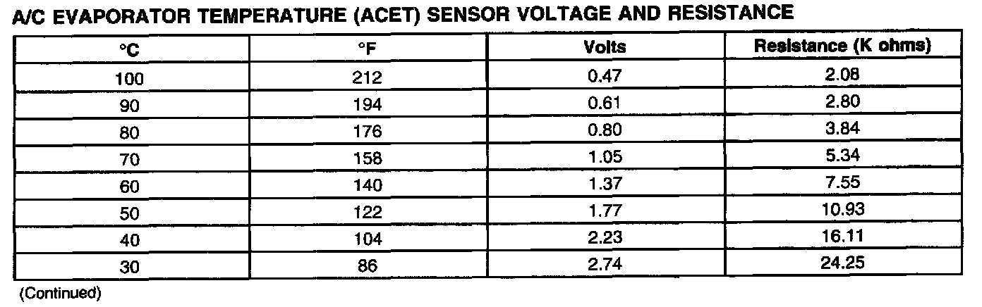 A/C Evaporator Temperature (ACET) Sensor Voltage And Resistance Chart (Part 2):