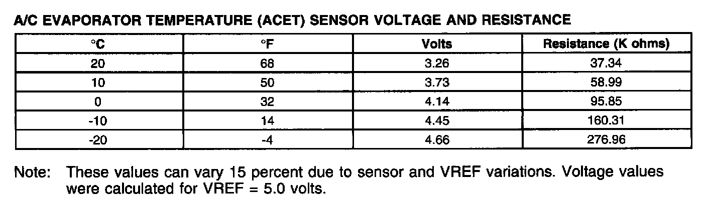 AIR CONDITIONING EVAPORATOR TEMPERATURE (ACET) SENSORA/C Evaporator Temperature (ACET) Sensor Voltage And Resistance Chart (Part 1):