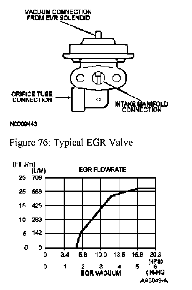 The EGR valve in the DPFE system is a conventional vacuum-actuated. The valve increases or decreases the flow of exhaust gas recirculation. As vacuum applied to the EGR valve diaphragm overcomes the spring force~ the valve begins to open. As the vacuum signal weakens at 5.4 kl)a (1.6 in-Hg) or less the spring force closes the valve. The EGR valve is fully open at about 15 kpa (4.5 in-Hg).