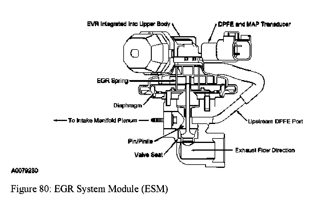 The ESM is an updated DPFE EGR system. It functions in the same manner as the conventional DPFE system however the various system components have been integrated into a single component called the ESM. The flange of the valve portion of the ESM bolts directly to the intake manifold with a metal gasket that forms the measuring orifice. This arrangement increases system reliability response time and system precision. By relocating the EGR orifice from the exhaust to the intake side of the EGR valve the downstream pressure signal measures manifold absolute pressure (MAP). The system provides the PCM with a differential DPFE signal identical to a traditional DPFE system.