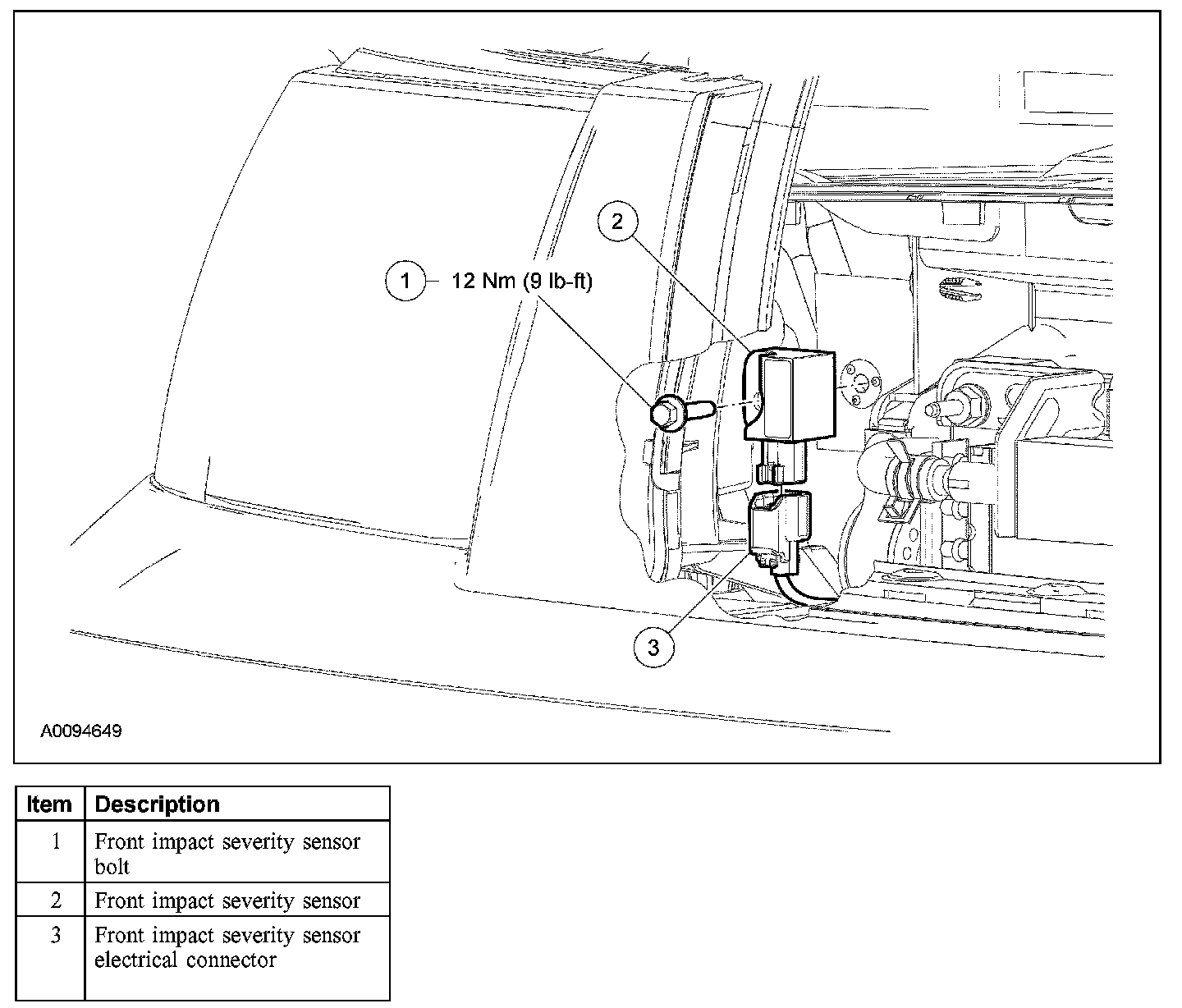 5. WARNING: The tightening torque of the air bag front impact severity sensor retaining nuts is critical for correct system operation.