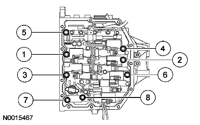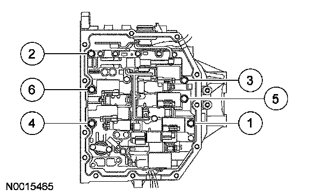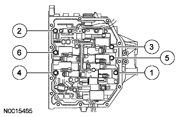 11. Remove the 6 main control valve body bolts in the sequence shown.