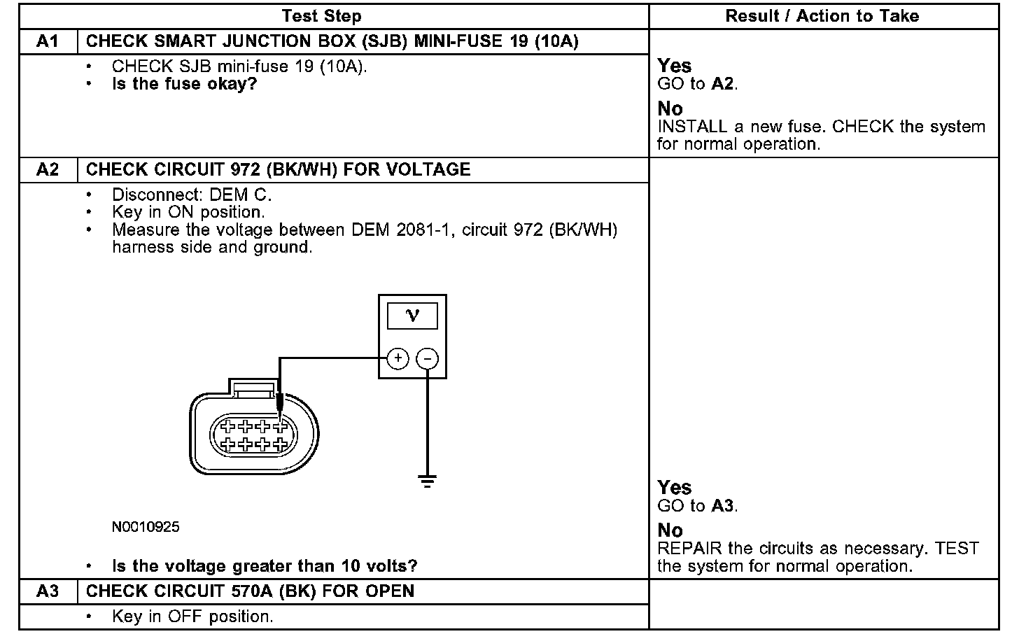 The DEM receives a 12-volt input from the SJB from mini-fuse 19 (10A) through circuit 972 (BK/WH). Ground is provided through circuit 570 (BK).