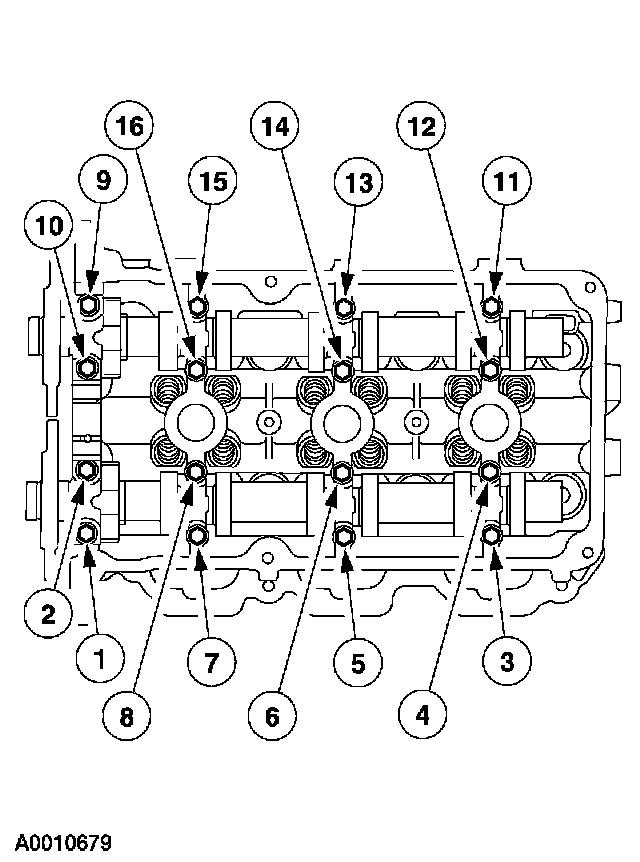 Loosen the LH camshaft cap bolts in the indicated sequence and remove the camshaft caps.