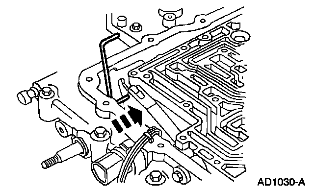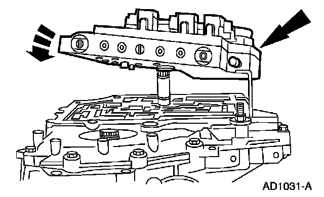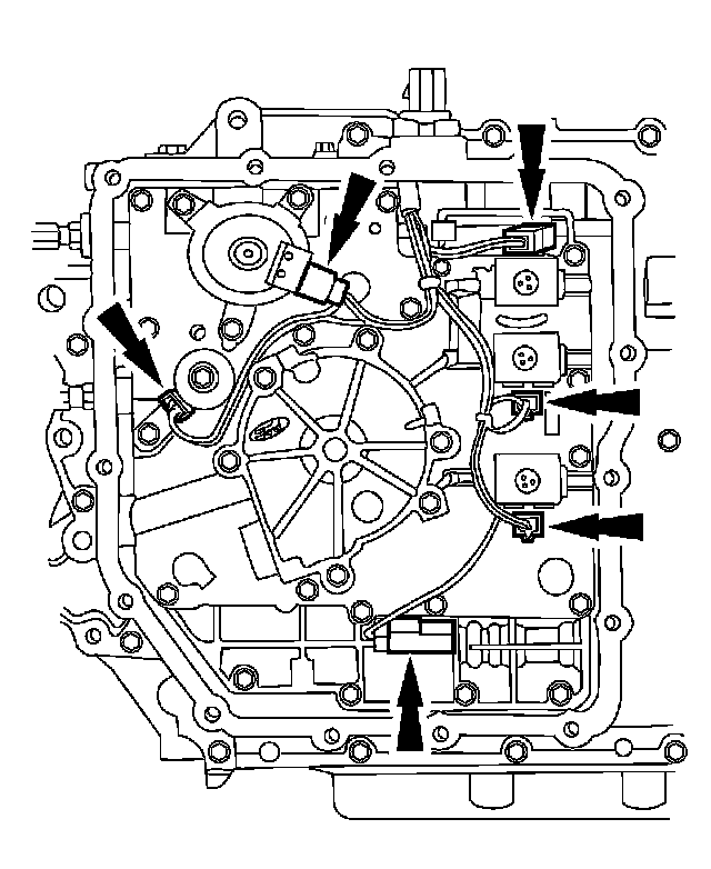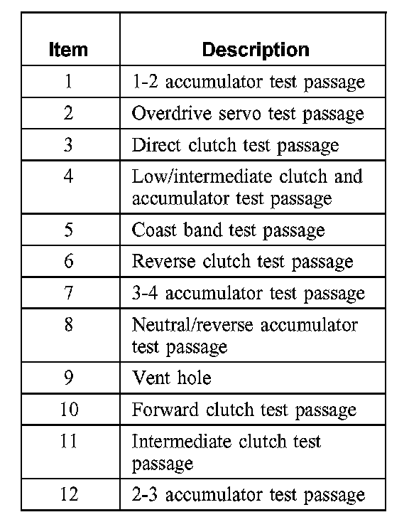 NOTE: When applying regulated 276 kPa (40 psi) air pressure to the appropriate passage, a dull thud should be heard when the clutch or band applies. There should be no hissing sound when the clutch or band applies.