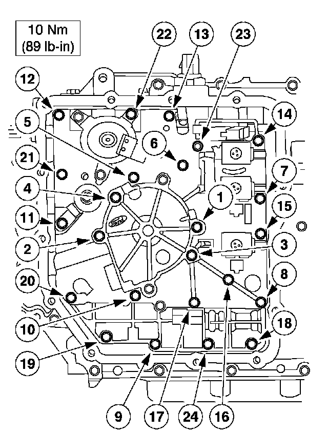 86. CAUTION: Do not use the bolts to draw pump assembly and main control valve body onto the chain cover case. Component damage may occur.