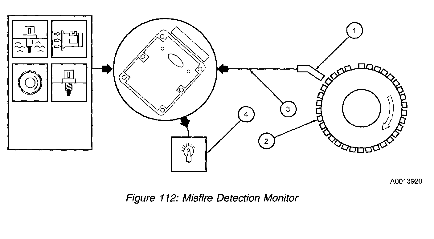 The misfire detection monitor is an on-board strategy designed to monitor engine misfire and identify the specific cylinder in which the misfire has occurred. Misfire is defined as lack of combustion in a cylinder due to absence of spark, poor fuel metering, poor compression, or any other cause. The misfire detection monitor is enabled only when certain base engine conditions are first satisfied. Input from the engine coolant temperature (ECT) or cylinder head temperature (CHT), intake air temperature (IAT), mass air flow (MAF) sensors is required to enable the monitor. The misfire detection monitor is also carried out during an on-demand self-test.