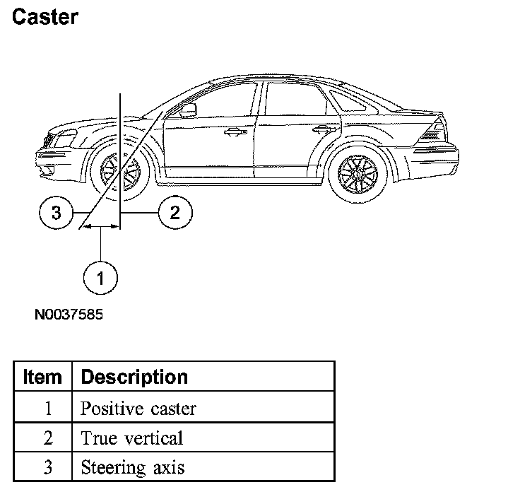 Caster is the deviation from vertical of an imaginary line drawn through the ball joints when viewed from the side. The caster specifications will give the vehicle the best directional stability characteristics when loaded and driven. The caster setting is not related to tire wear.