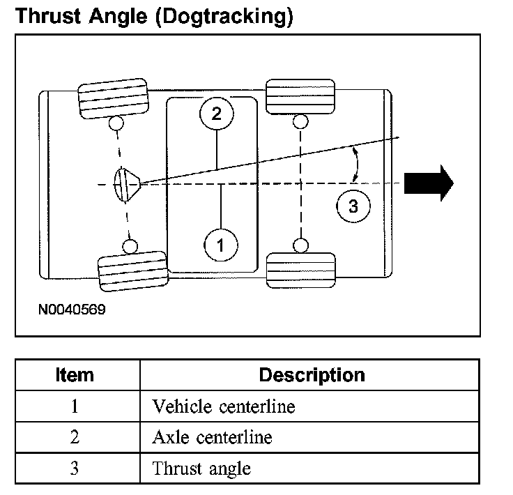 Incorrect thrust angle (also known as dogtracking) is the condition in which the rear axle is not square to the chassis. Heavily crowned roads can give the illusion of dogtracking.