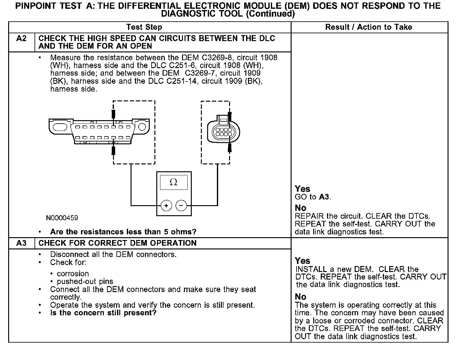 The DEM communicates with the diagnostic tool through the high speed controller area network (CAN), circuits 1908 (WH) and 1909 (BK). The high speed CAN is not designed to operate under single point fault conditions. If either circuit is shorted to voltage or the high speed CAN data plus is shorted to ground, module-to-module and module-to-tester communication is not possible. If the high speed CAN data minus is shorted to ground or an open exists on either bus line, module-to-module and module-to-tester communication is marginal at best. The high speed CAN bus may remain operational when one of the two termination resistors are not present. Check circuits 1908 (WH) and 1909 (BK) between the DEM C3269 and the data link connector (DLC) C251. The total resistance values must not be more than 5 ohms. If the resistance is more than 5 ohms there is an open in one of the high speed CAN circuits, damage to the DLC C251, damage to the DEM C3269, or a problem in an in-line connector.