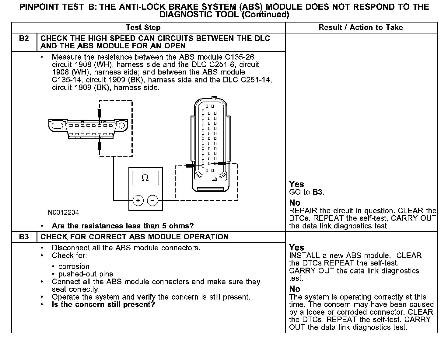 The ABS module communicates with the diagnostic tool through the high speed controller area network (CAN), circuits 1908 (WH) and 1909 (BK). The high speed CAN is not designed to operate under single point fault conditions. If either circuit is shorted to voltage or the high speed CAN data plus is shorted to ground, module-to-module and module-to-tester communication is not possible. If the high speed CAN data minus is shorted to ground or an open exists on either bus line, module-to-module and module-to-tester communication is marginal at best. The high speed CAN bus may remain operational when one of the two termination resistors are not present. Check circuits 1908 (WH) and 1909 (BK) between the ABS module C135 and the data link connector (DLC) C251. The total resistance values must not be more than 5 ohms. If the resistance is more than 5 ohms there is an open in one of the high speed CAN circuits, damage to the DLC C251, damage to the ABS module C135, or a problem in an in-line connector.