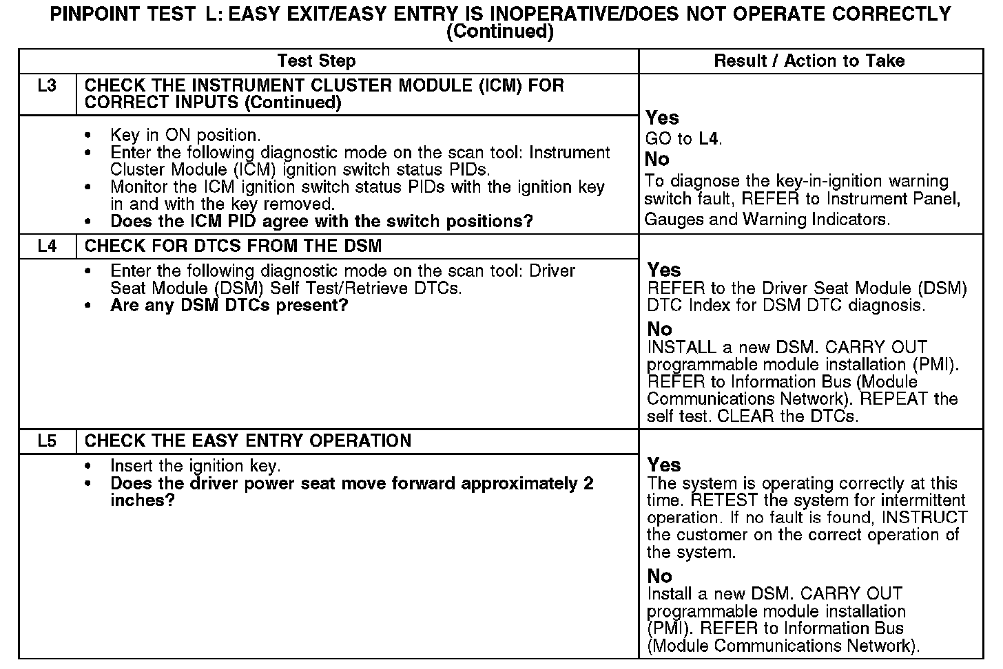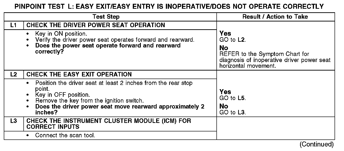 PINPOINT TEST L: EASY EXIT/EASY ENTRY IS INOPERATIVE/DOES NOT OPERATE CORRECTLYL1-L3: