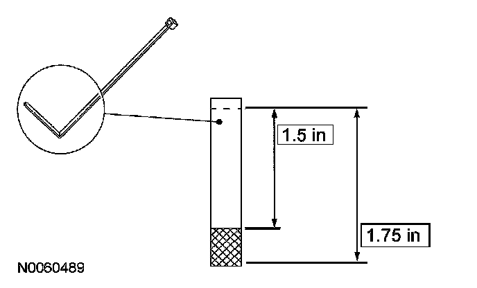 3. Using a tie strap, measure 44.5 mm (1.75 inch) from the end and bend it at a 90-degree angle, measure from the end up to 38.1 mm (1.5 inch) and place an index mark. Place it in the filler opening and check the fluid. The correct fluid level will be between the bottom of the dipstick and the 38.1 mm (1.5 inch) maximum fill mark.
