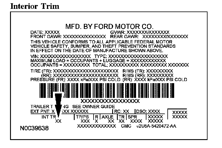 Interior trim codes are listed as a 2-part code. The first character identifies the interior trim type. The second character identifies the interior trim color.