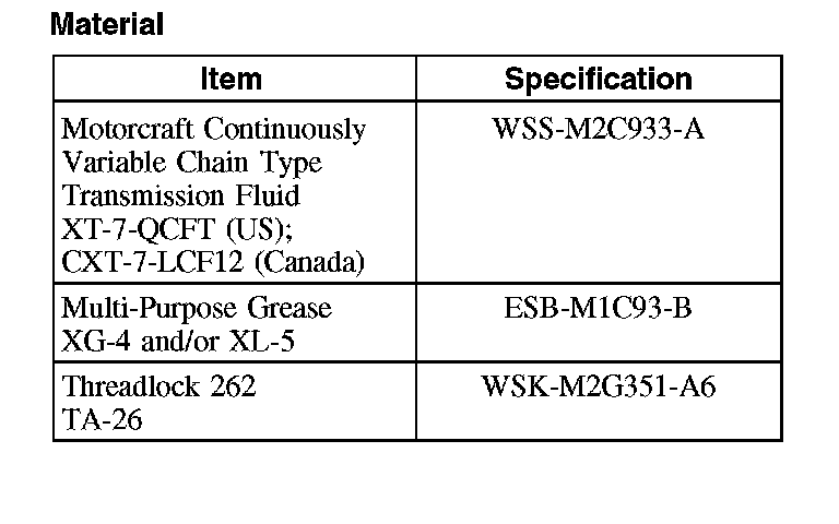 CAUTION: MERCON (R), MERCON (R) V, MERCON (R) SP, Motorcraft Premium Automatic Transmission Fluid and Motorcraft Continuously Variable Chain Type Transmission Fluid are not interchangeable transmission fluids. The use of any fluid other than what is recommended for this transaxle will cause transaxle damage.