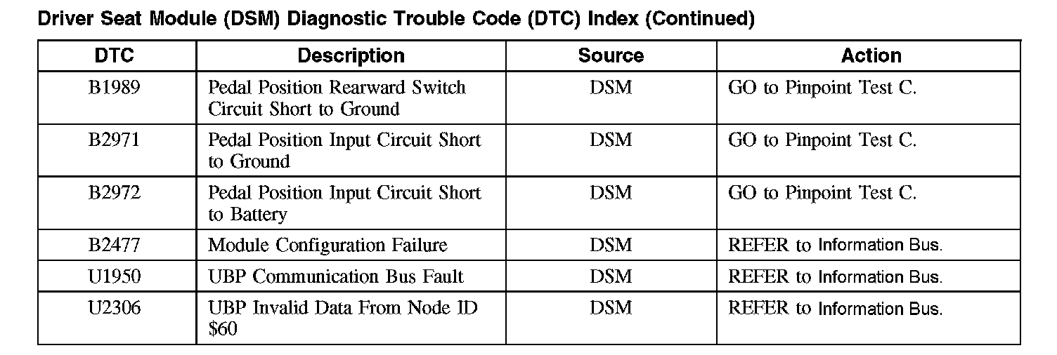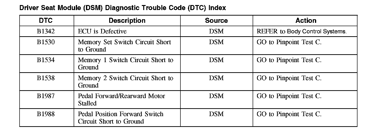Driver Seat Module (DSM) Diagnostic Trouble Code (DTC) IndexB1342-B1988:
