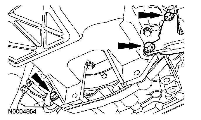 52. Position the LH catalytic converter bracket and install the 3 engine-to-transaxle bolts.