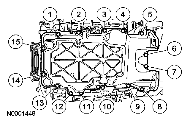 53. Tighten the 15 oil pan bolts in the sequence shown to 25 Nm (18 lb-ft).