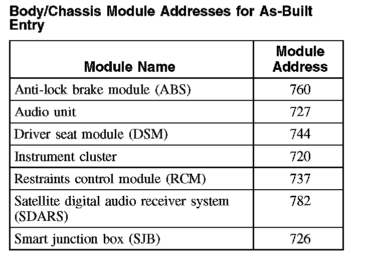 Body/Chassis Module Addresses For As-Built Entry: