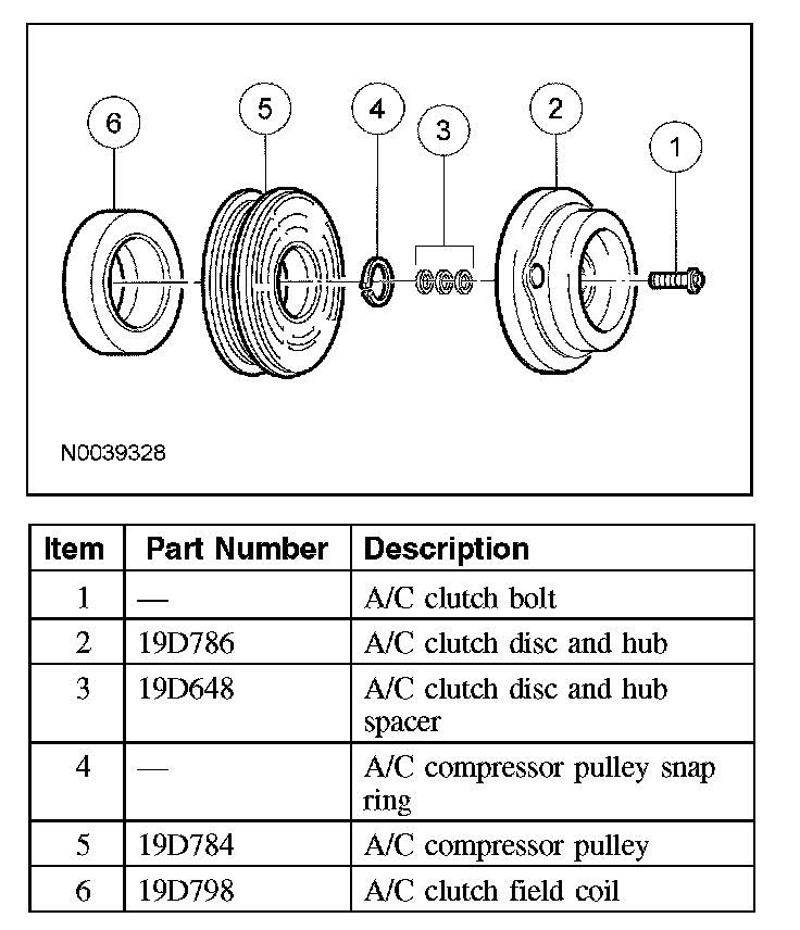 - Internal FS18 A/C compressor components are not serviced separately. The A/C compressor is serviced only as an assembly. The clutch disc and hub, A/C compressor pulley and bearing, and clutch field coil are serviceable.