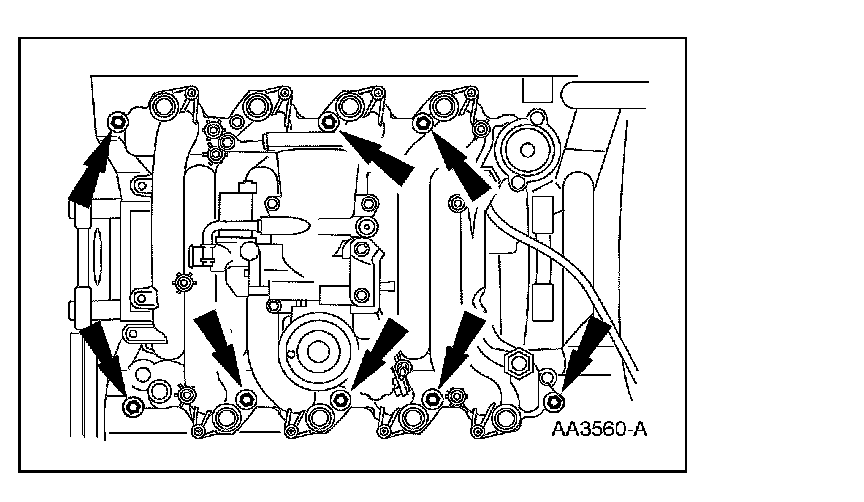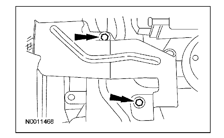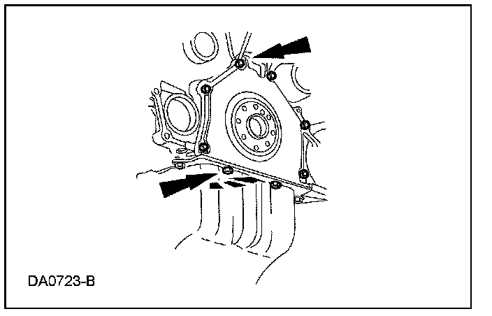 5. Remove the 2 oil pan-to-crankcase rear seal retainer plate bolts and the 6 crankcase rear seal retainer plate bolts.