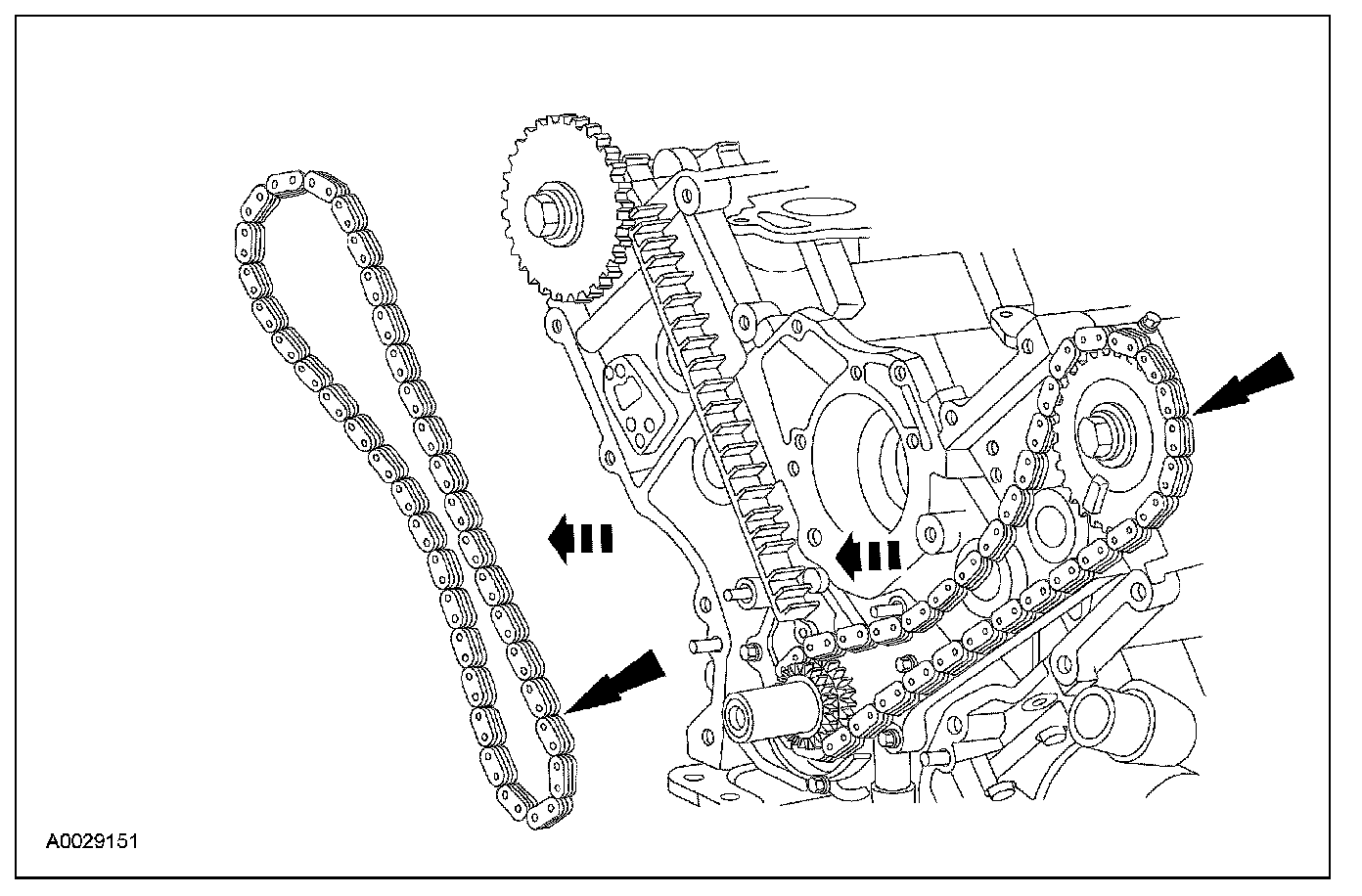 ^ Remove the RH timing chain from the crankshaft sprocket.