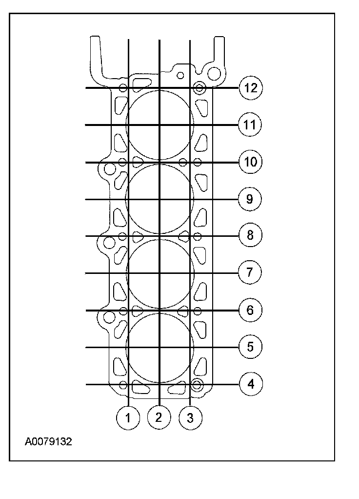 Using a straightedge and a feeler gauge, inspect the cylinder head for flatness in the sequence shown.