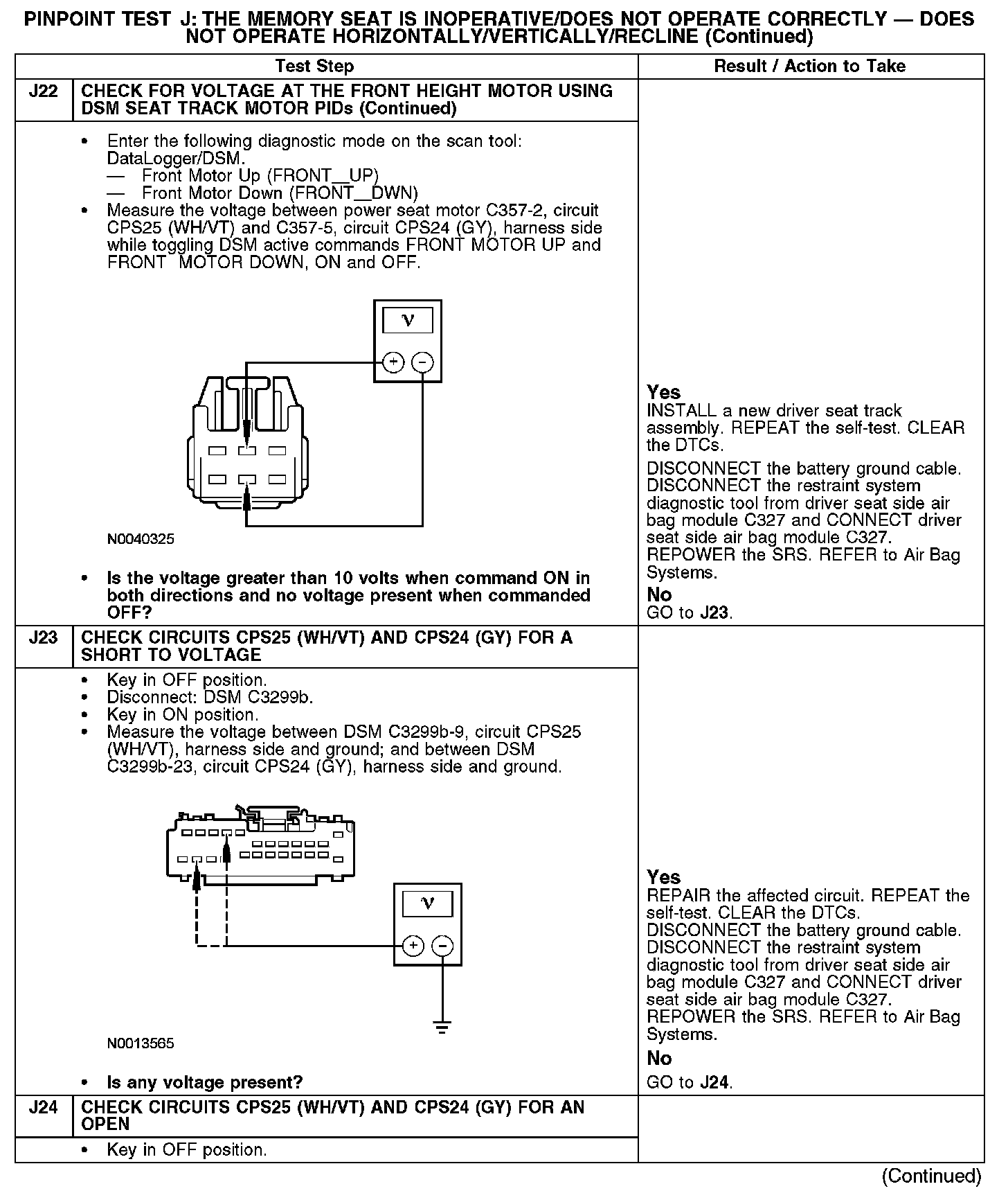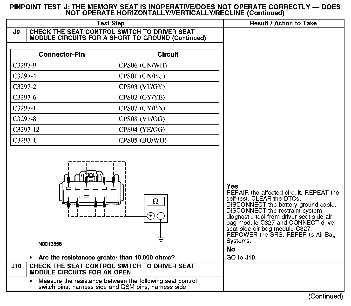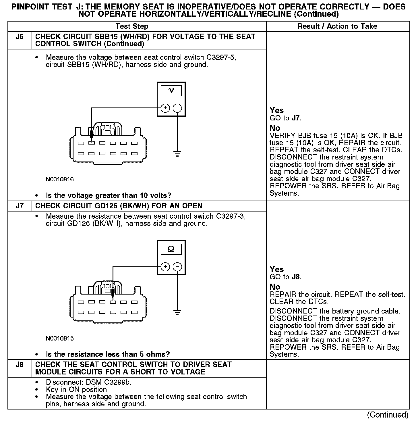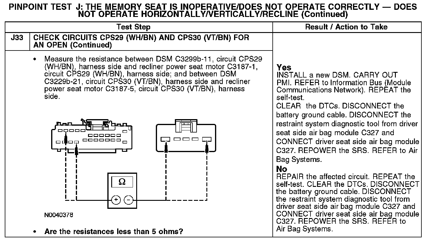 The following pinpoint test diagnoses a memory seat that does not operate in one or more directions when using the seat control switch. If the memory seat moves in all directions using the seat control switch, GO to Pinpoint Test K. Test K: The Memory Seat Does Not Operate Correctly - Does Not Operate Using the Memory Set Switch