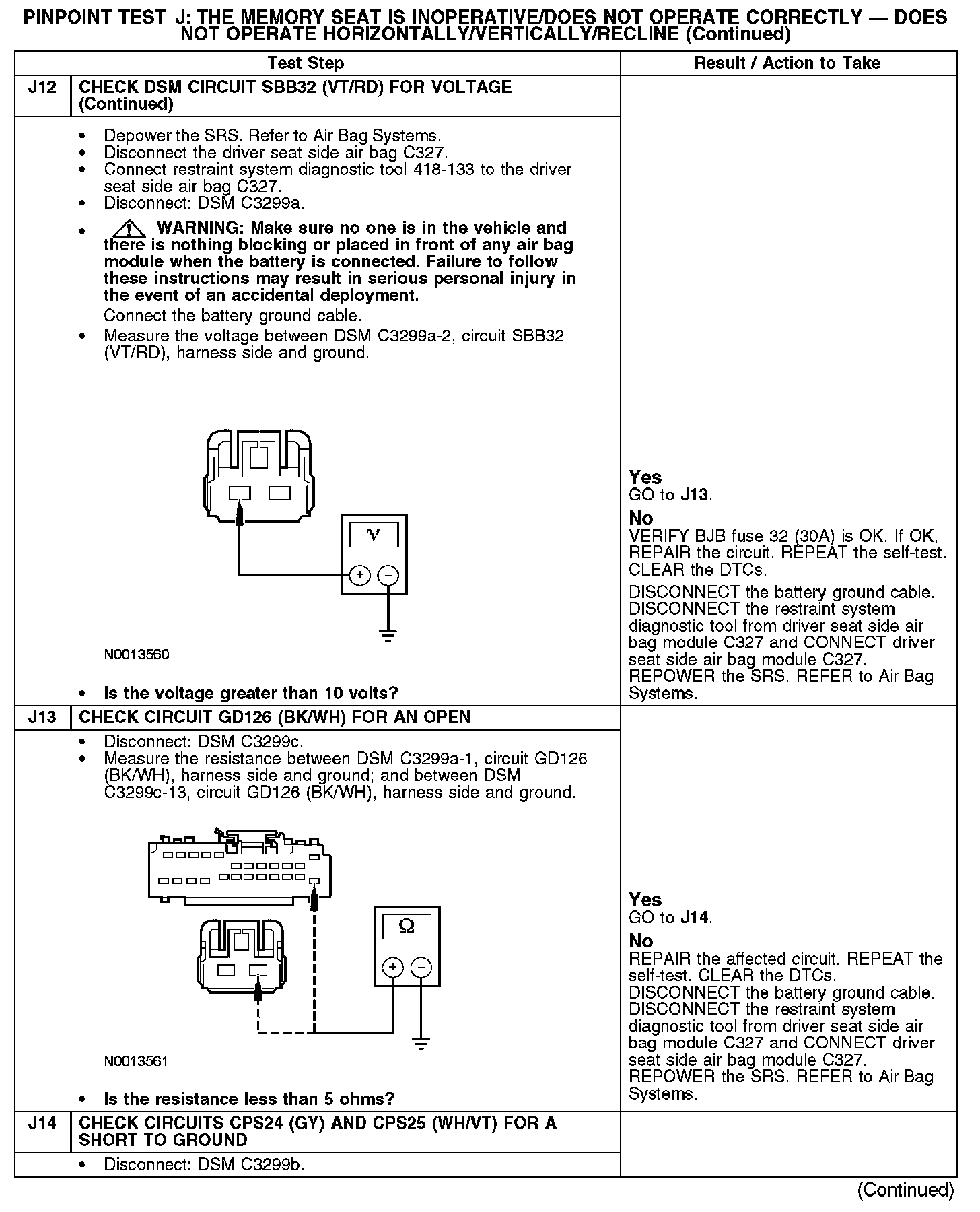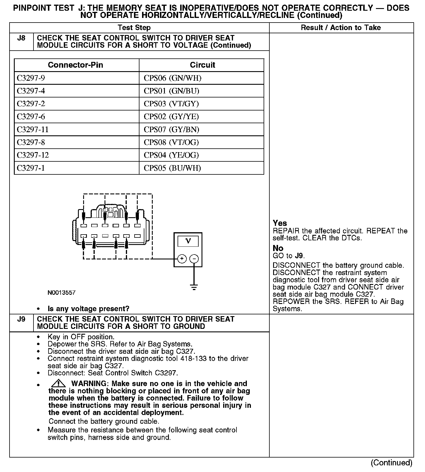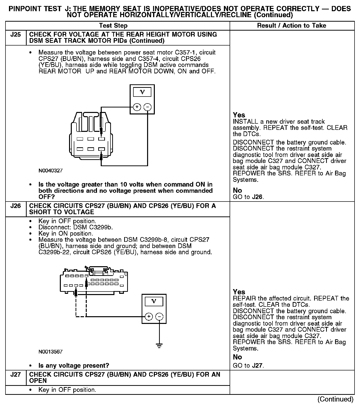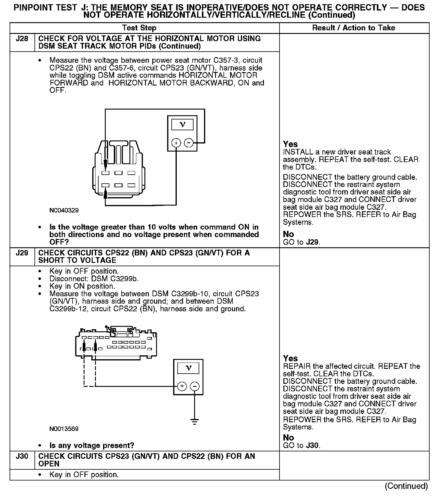 The following pinpoint test diagnoses a memory seat that does not operate in one or more directions when using the seat control switch. If the memory seat moves in all directions using the seat control switch, GO to Pinpoint Test K. Test K: The Memory Seat Does Not Operate Correctly - Does Not Operate Using the Memory Set Switch